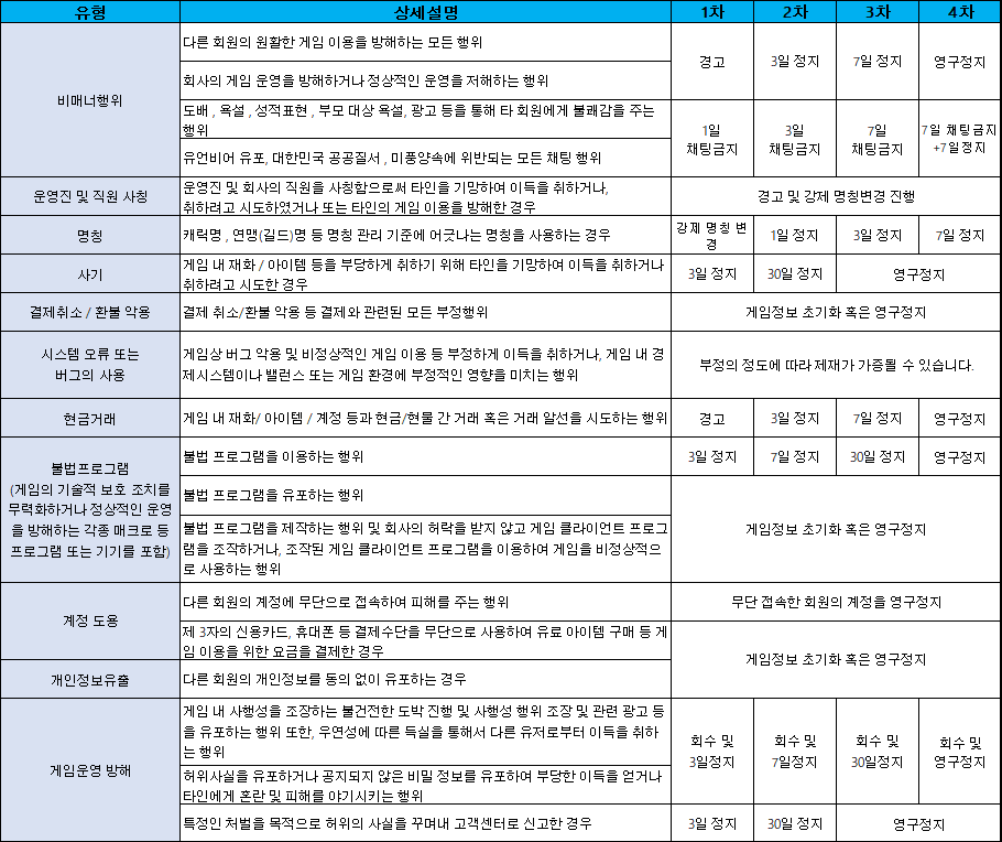 ④ 동조 제1항의 세부 기준에 규정되어있지 않더라도 “게임”에 부정적인 영향을 주거나 다른 “회원”에게 피해를 주는 행위에 대해서 제재가 가해질 수 있습니다.